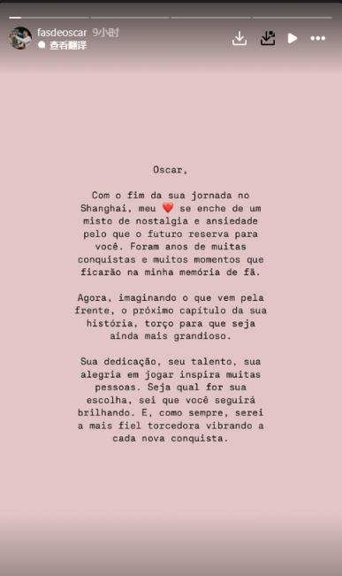 12月20日讯 奥斯卡的国外球迷团体在社媒发告别信,称奥斯卡在中国的旅途即将结束。